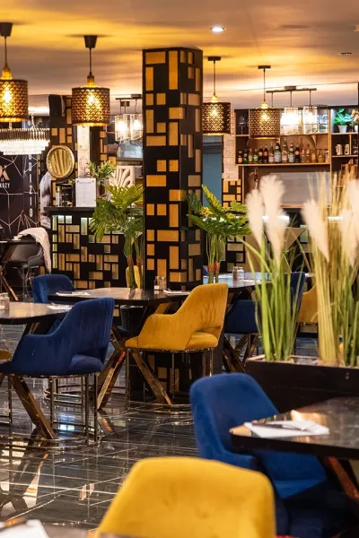 La salle principale du Kozy vous accueille dans un cadre à la fois moderne et chaleureux. Avec sa décoration design, son mobilier neuf et confortable, elle offre un lieu idéal pour partager de bons moments en famille, entre amis ou avec des collègues.